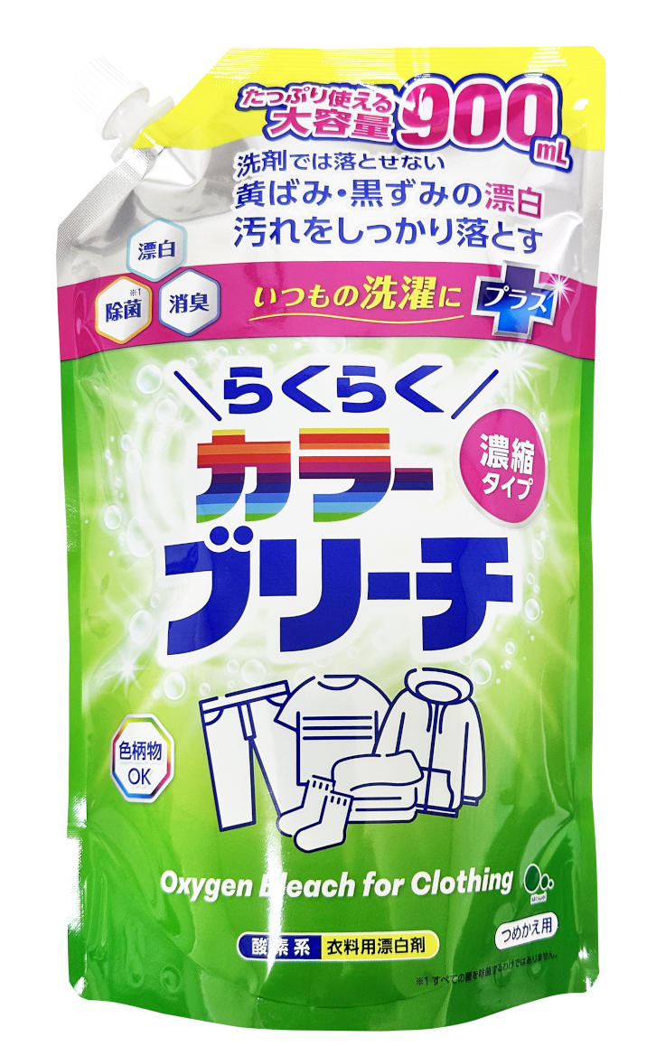 色・柄物にも安心な濃縮酸素系漂白剤。洗剤では落としづらい黄ばみ・黒ずみに。除菌・消臭。